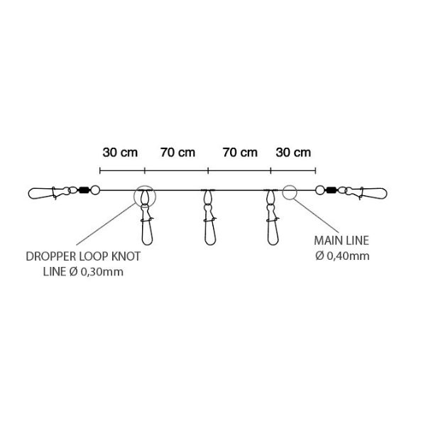 Aparejo montado en fluorocarbono de 3 brazos con imperdible de seguridad. Ideal para la pesca de eging. Línea madre del 0,40mm y brazos del 0,30mm.